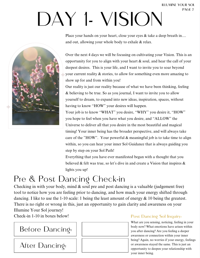 You will receive a beautiful Digital/Printable- 64 page PDF that reflects the season of Spring~ filled with inspiration + information based on the Principles of the Law of Attraction, a Daily Dance Video + Sol Tip link, a Guided Visualization link, and Reflective Journal pages to capture your thoughts, feelings and insights on your Sol Path Journey.